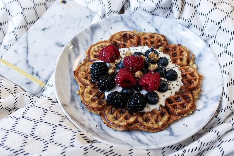 Olen Instagramissa pariin kertaan postannut kuvia vohveleista, joita syön nykyään aina viikonloppuisin aamiaiseksi. Ostin vohveliraudan ihan vähän aikaa sitten ja pelkäsin sen koituvan tämän hyvinvointiprojektin kohtaloksi, mutta tässä kävikin päinvastoin. Keksinpäs miten tehdään terveellisiä, mutta silti maukkaita vohveleita jotka sopivat esim. aamiaiseksi. Allaolevasta ohjeesta tulee yksi vohveli: