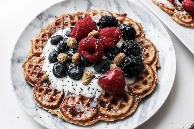 Sekoita kaikki ainekset sekaisin ja paista vohveliraudalla. Lopuksi koristele vohveli sekoittaalla agavesiirappia (tai hunajaa) kreikkalaiseen jogurttiin ja heitä vielä erilaisia marjoja päälle.